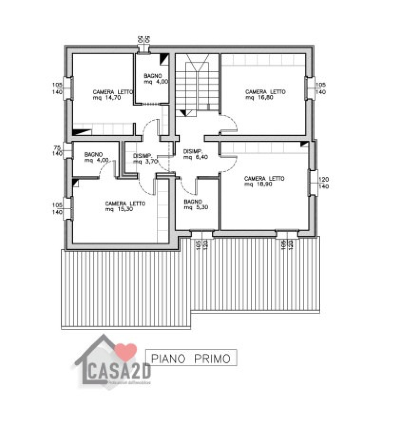 Una scala conduce al primo piano, dove troviamo la zona notte con tre camere da letto, una camera singola e altri tre bagni.