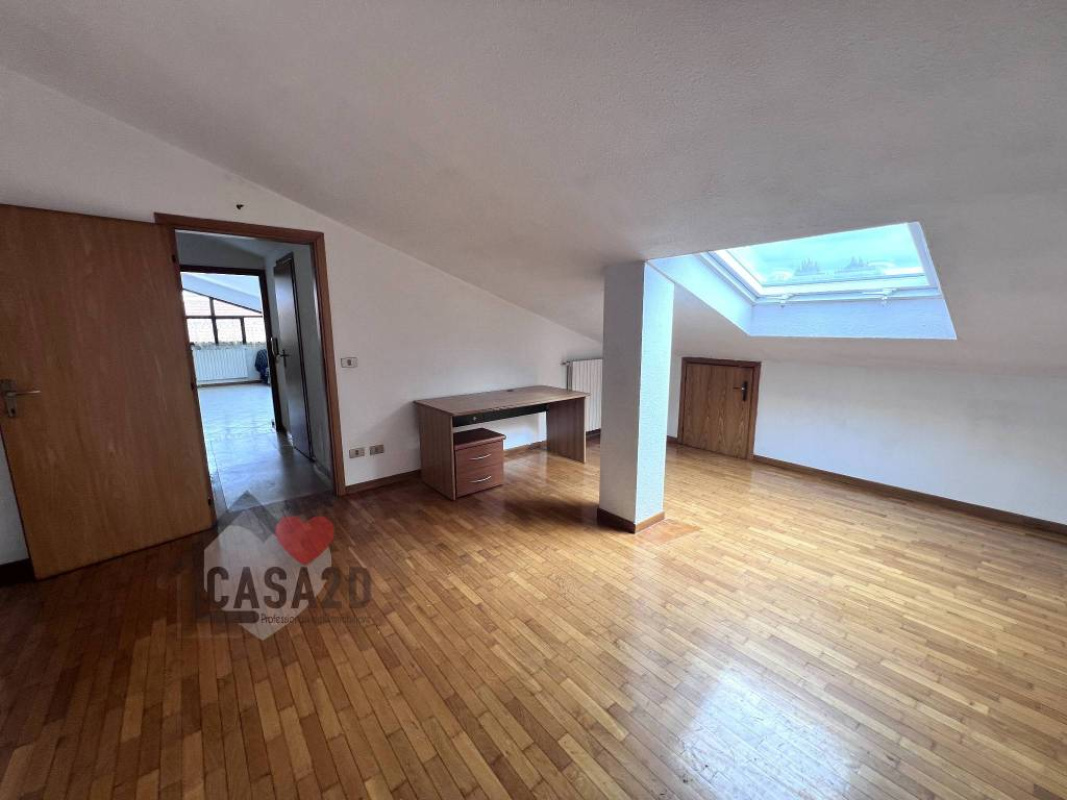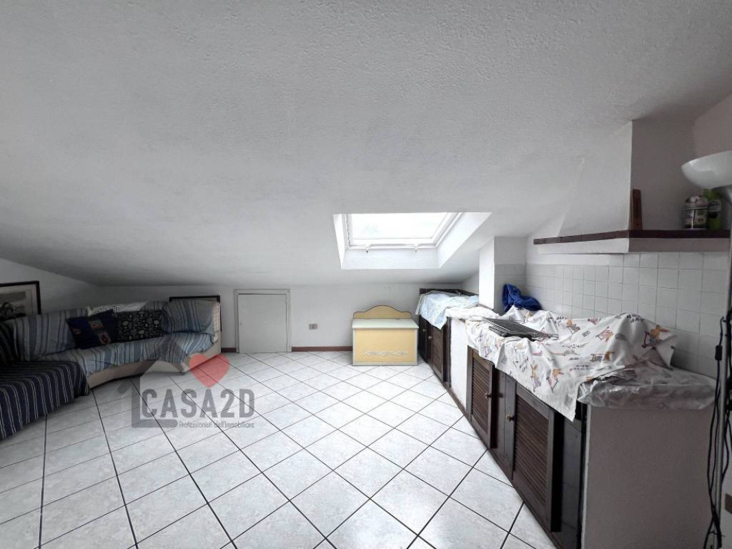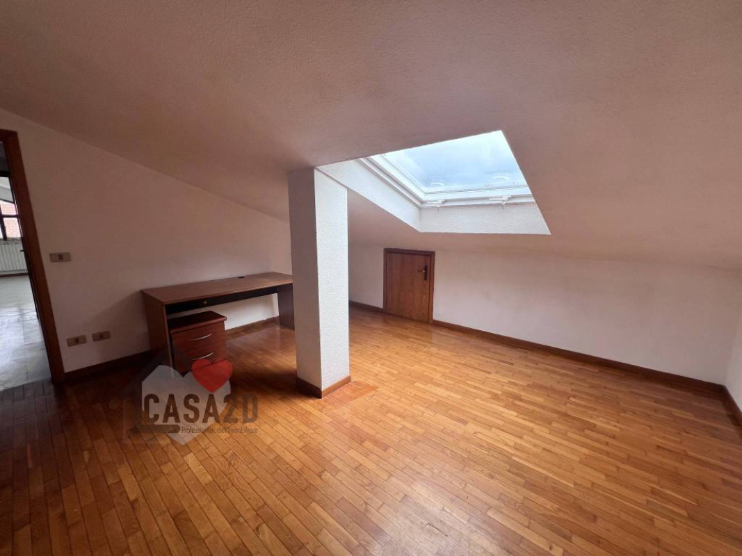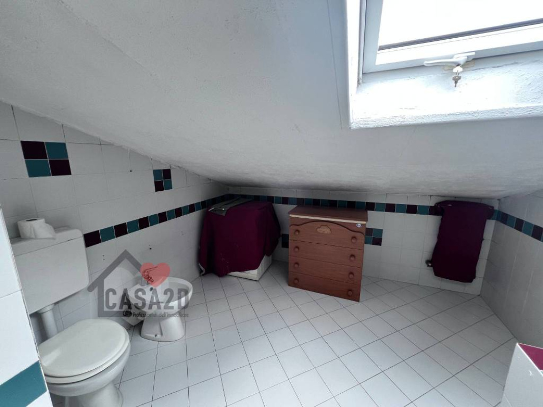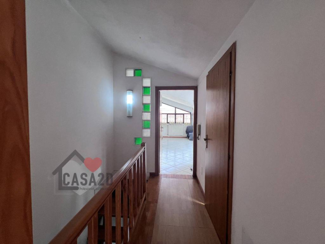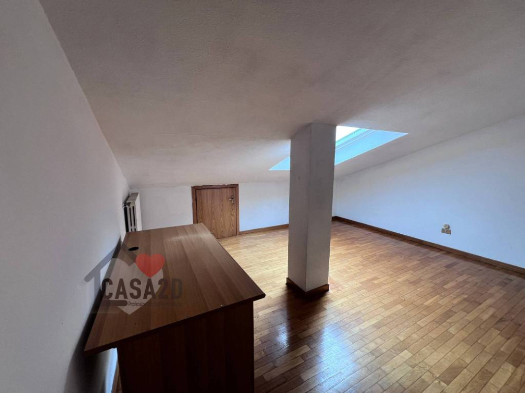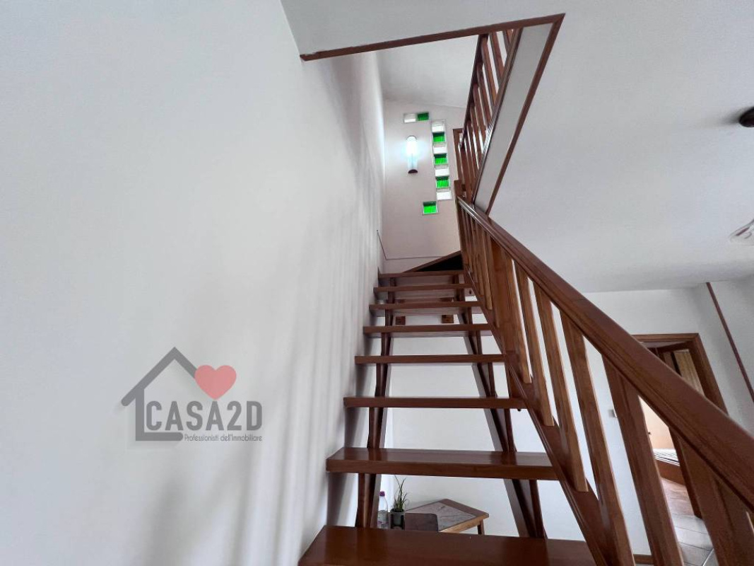 Dal soggiorno, una elegante scala a vista in legno conduce al sottotetto, dove si trovano due ulteriori stanze molto spaziose e un vano attualmente utilizzato come bagno.