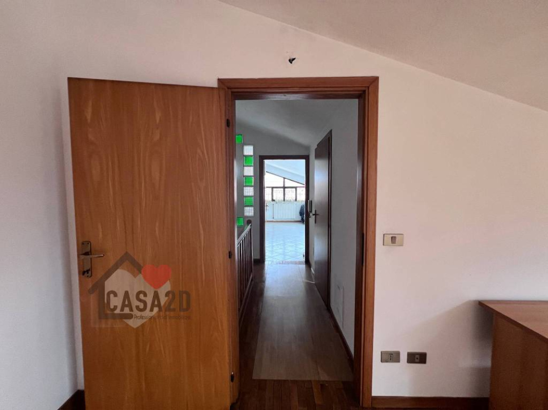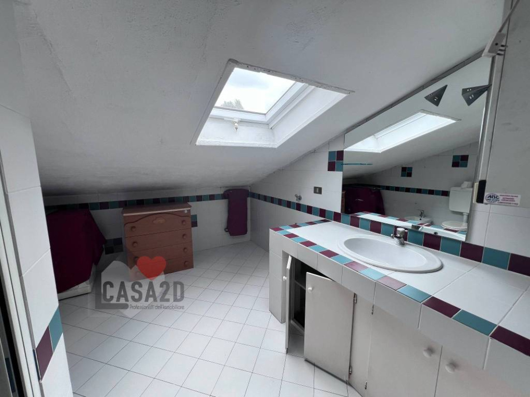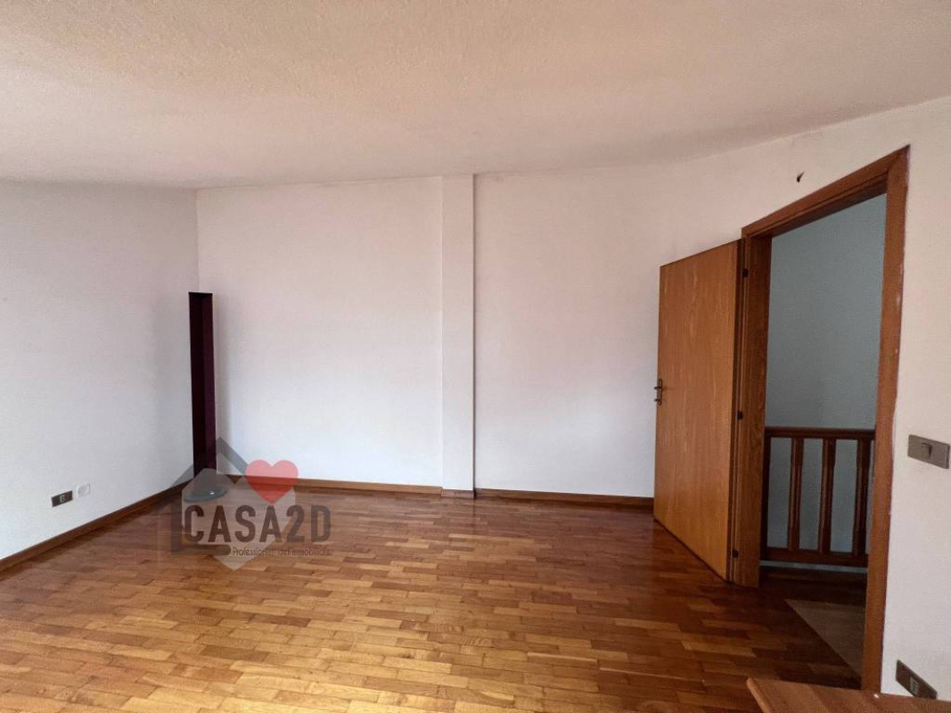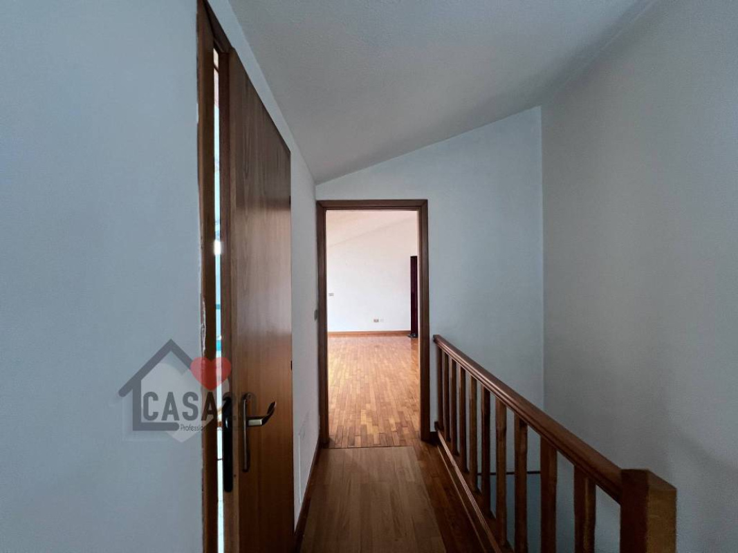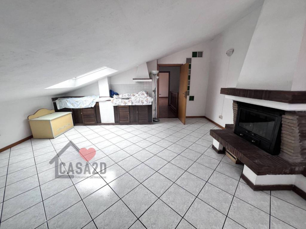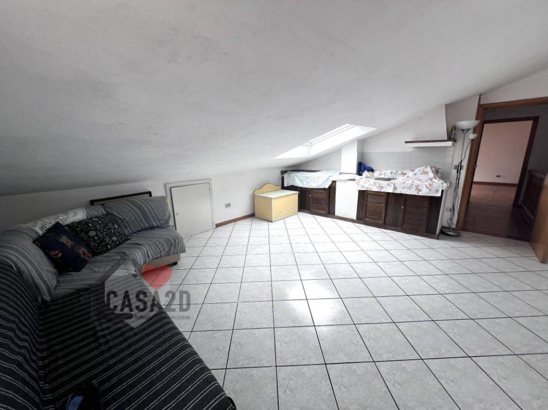 Dal soggiorno, una elegante scala a vista in legno conduce al sottotetto, dove si trovano due ulteriori stanze molto spaziose e un vano attualmente utilizzato come bagno.