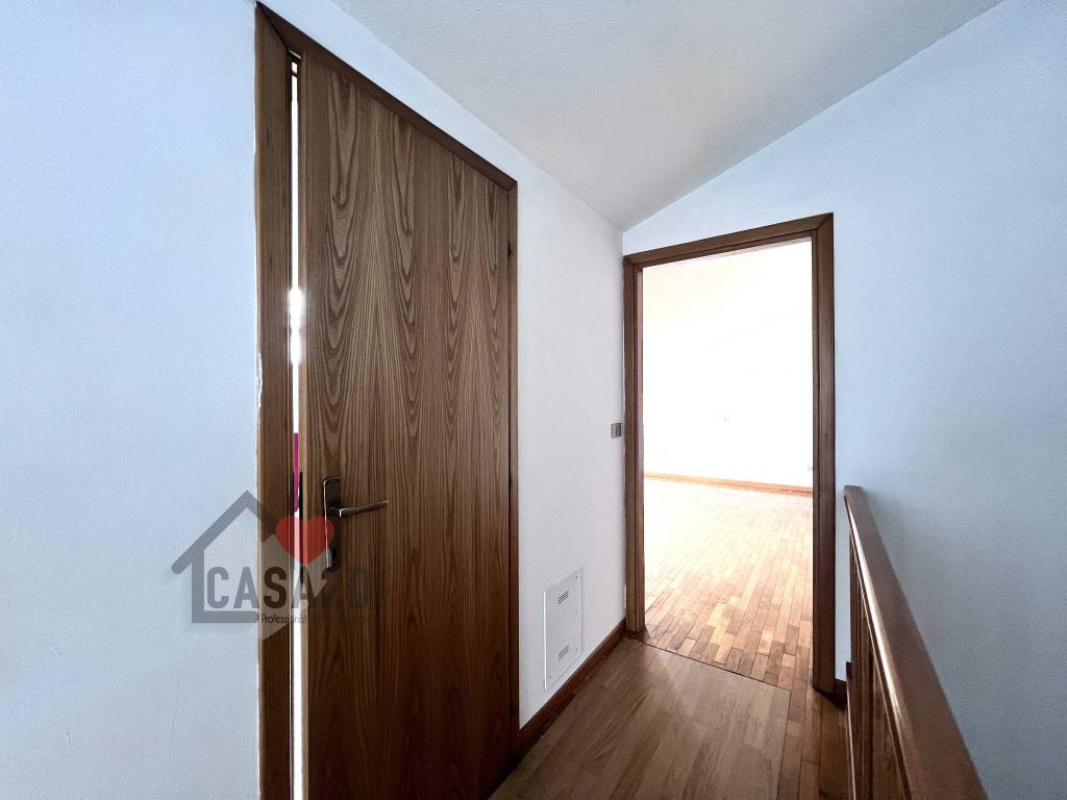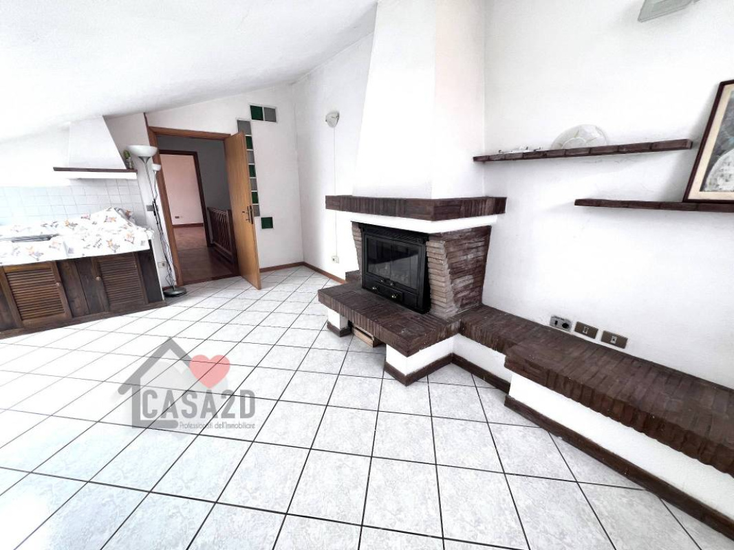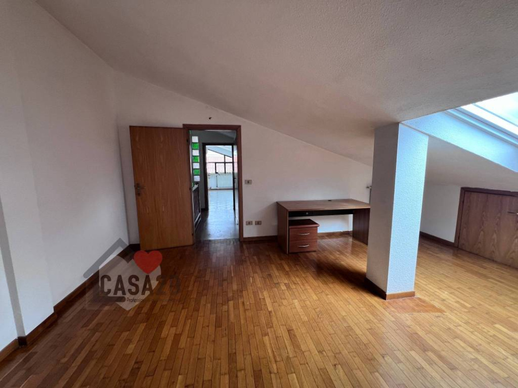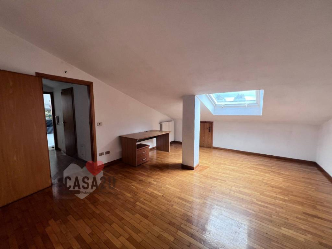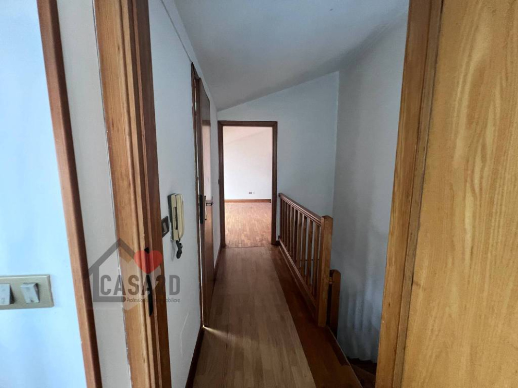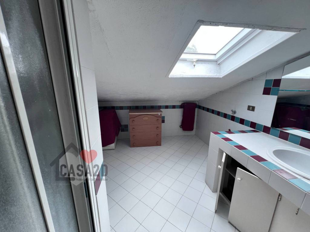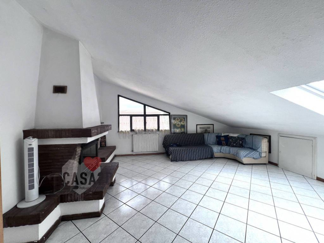 Dal soggiorno, una elegante scala a vista in legno conduce al sottotetto, dove si trovano due ulteriori stanze molto spaziose e un vano attualmente utilizzato come bagno.