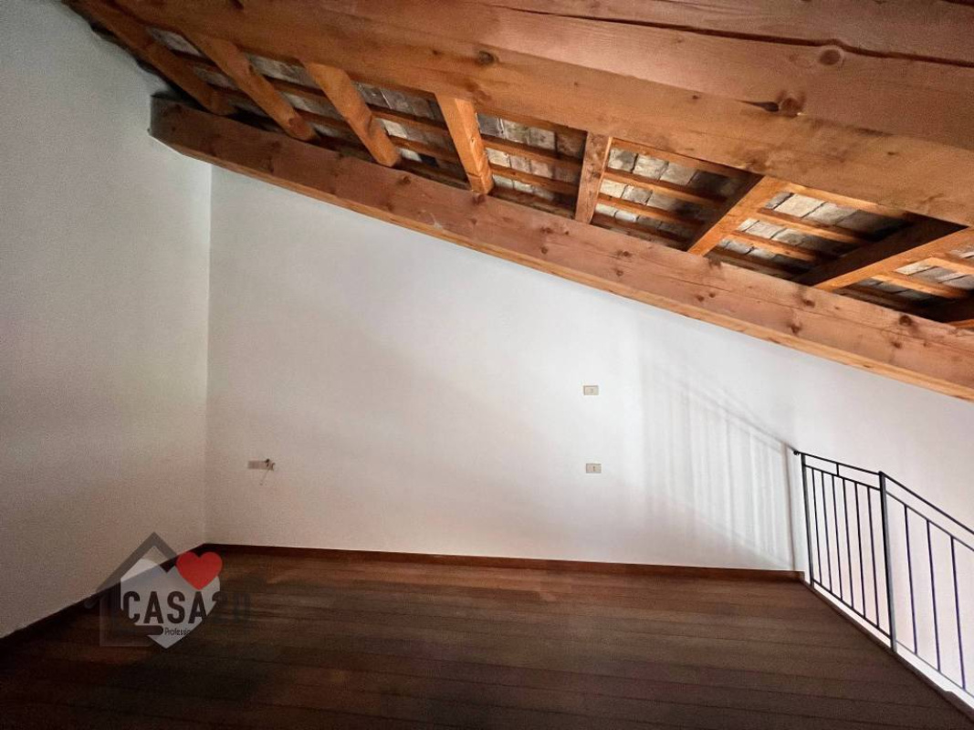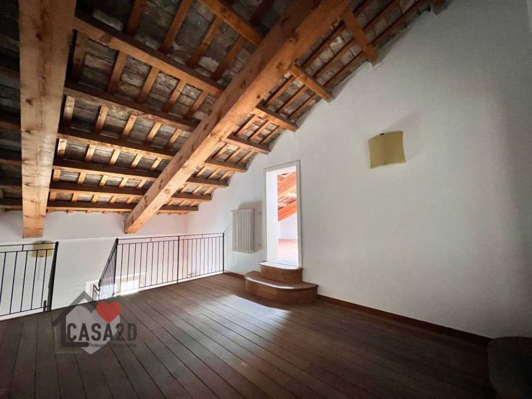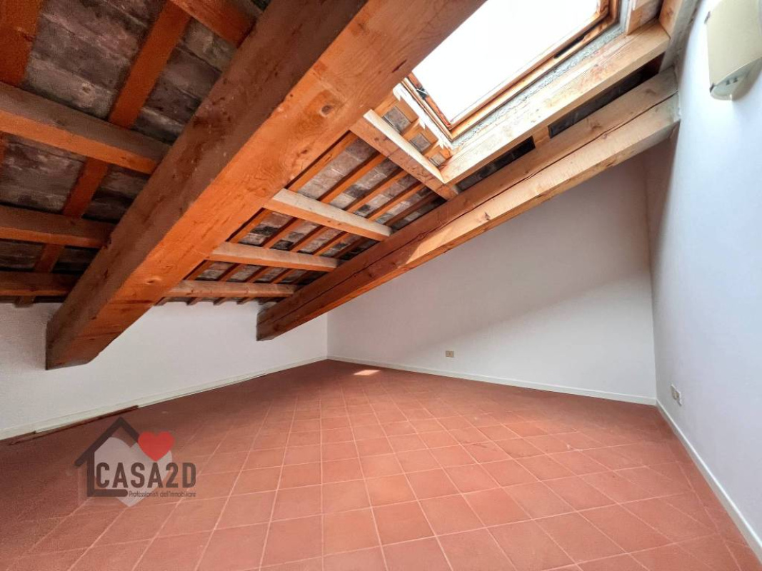 La stanza principale presenta una scala in legno a vista, che conduce al sottotetto, dove si trova un soppalco, altre due stanze e un secondo bagno.