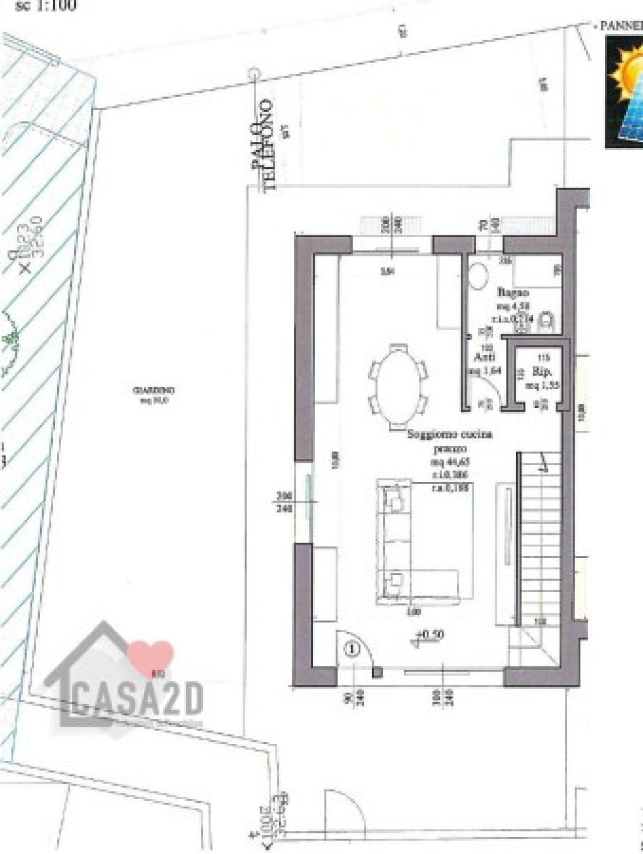 L’abitazione è così composta: Piano terra Ingresso tramite giardino frontale con accesso diretto al soggiorno con cucina a vista in open space di circa 46 mq, ambiente ampio e luminoso.